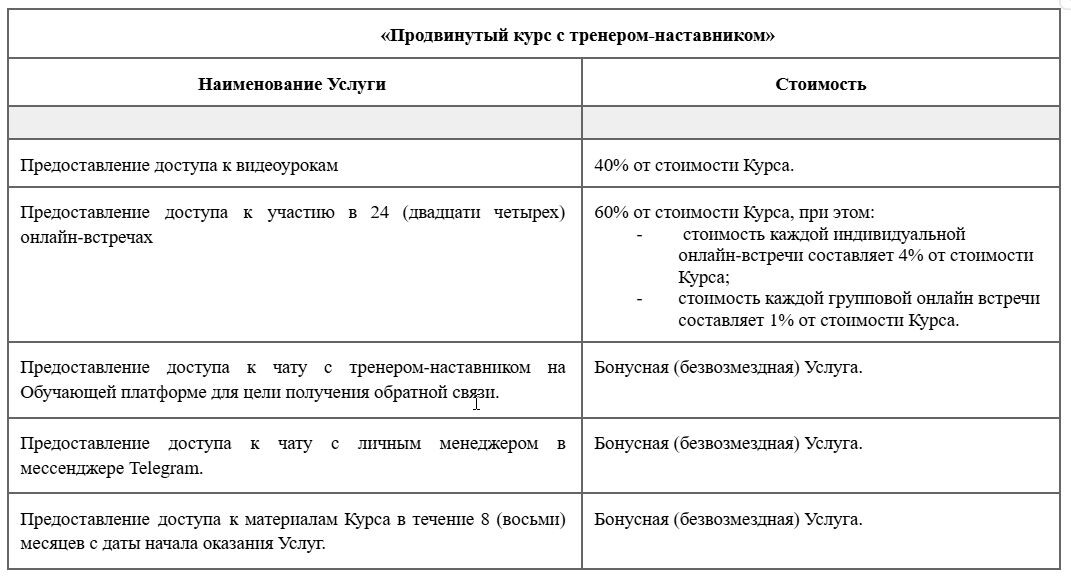 3.16. Услуги по программе Курса «Продвинутый курс с тренером-наставником» включают в себя предоставление доступа к следующим Услугам: