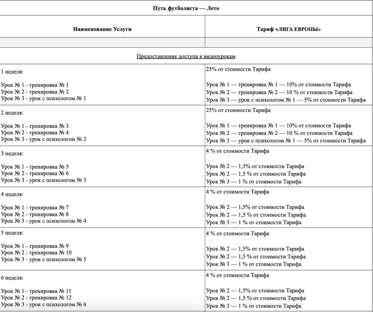 3.13. Услуги по программе Курса «Путь футболиста — Лето» по Тарифу «ЛИГА ЕВРОПЫ» включают в себя предоставление доступа к следующим Услугам: