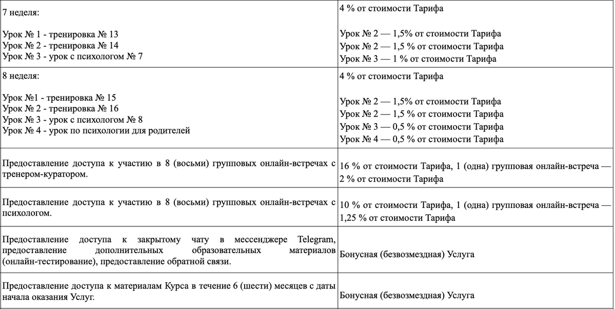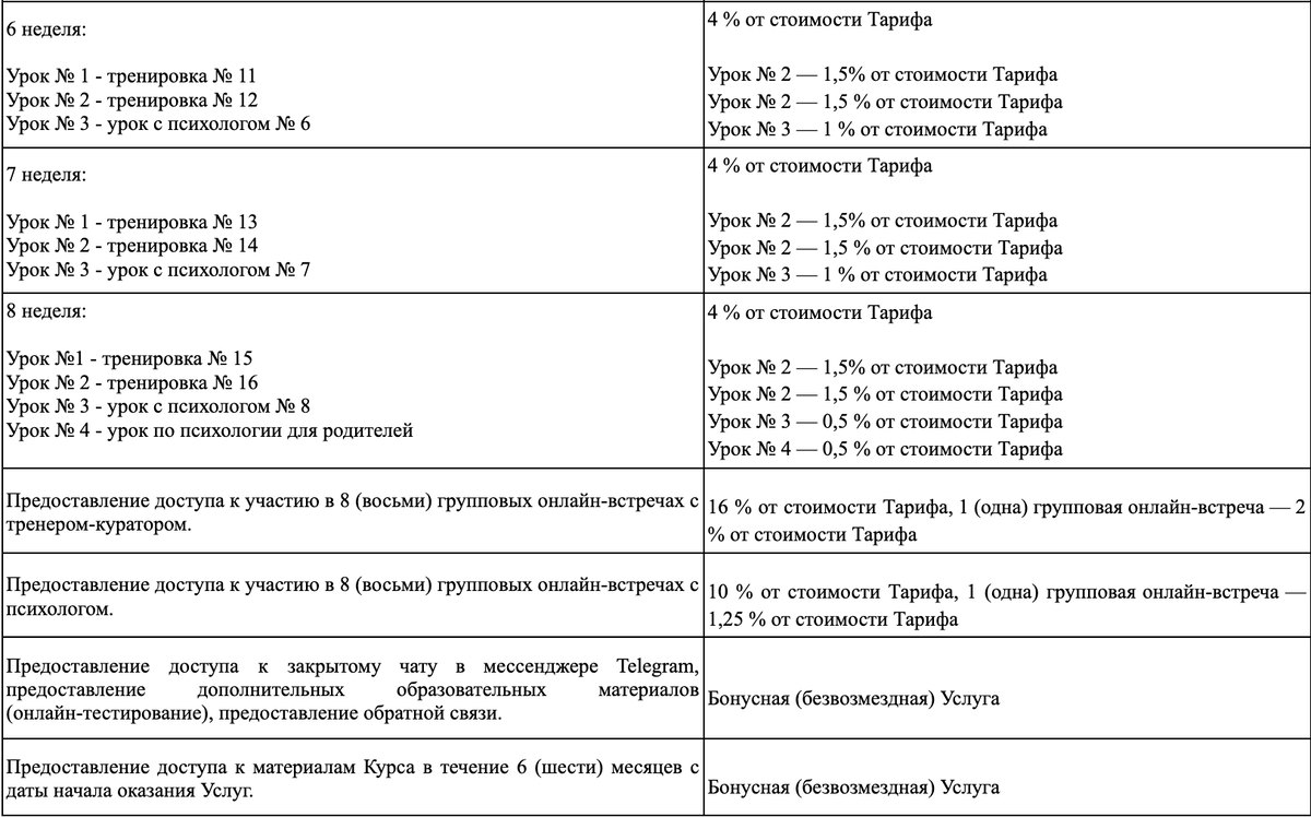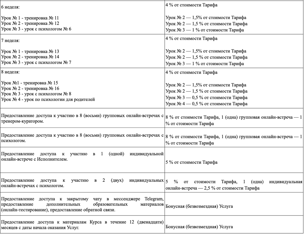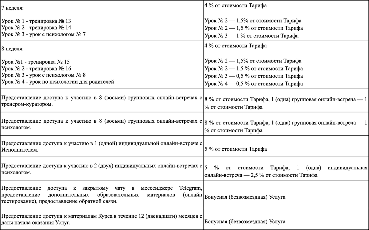 3.2. Исполнителем оказываются Услуги по программе Курса «Путь футболиста — Зима» в онлайн-формате согласно указанным на Сайте Тарифам, а именно: