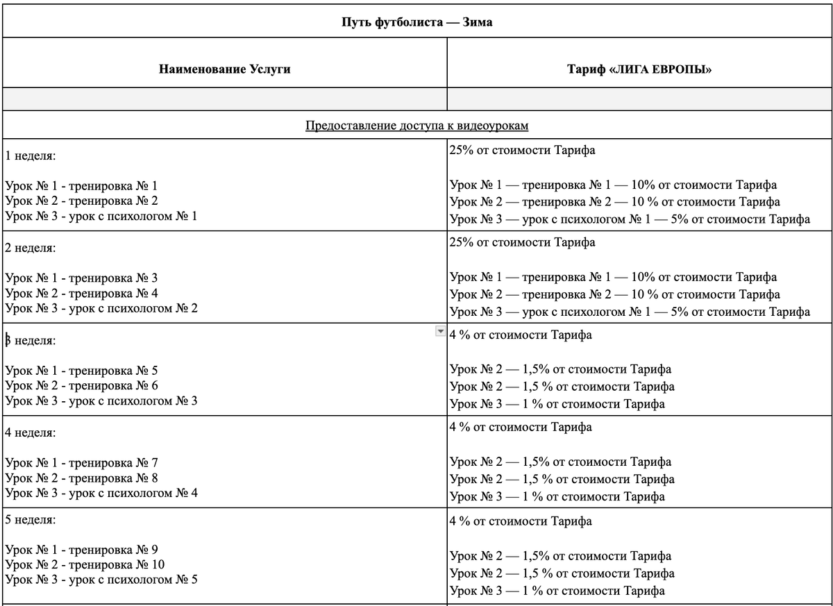 3.11. Услуги по программе Курса «Путь футболиста — Зима» по Тарифу «ЛИГА ЕВРОПЫ» включают в себя предоставление доступа к следующим Услугам: