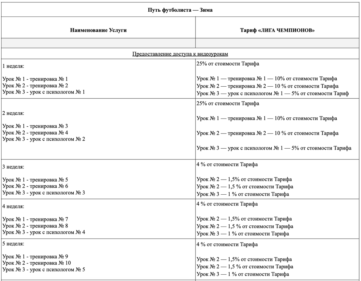 3.12. Услуги по программе Курса «Путь футболиста — Зима» по Тарифу «ЛИГА ЧЕМПИОНОВ» включают в себя предоставление доступа к следующим Услугам: