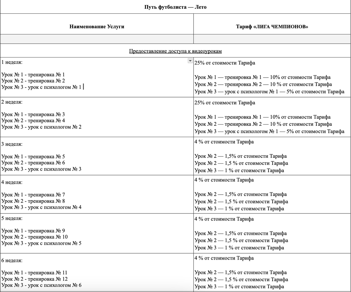 3.14. Услуги по программе Курса «Путь футболиста — Лето» по Тарифу «ЛИГА ЧЕМПИОНОВ» включают в себя предоставление доступа к следующим Услугам: